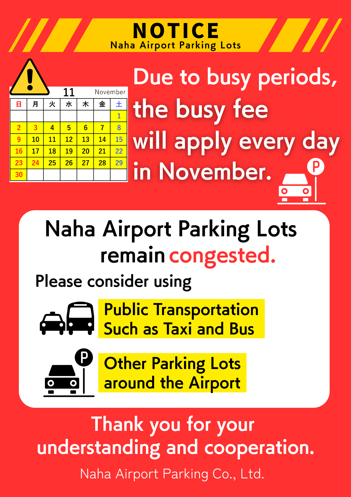 Please be advised that “the busy fee” will apply daily at the Naha Airport Parking Lots throughout the month of November.