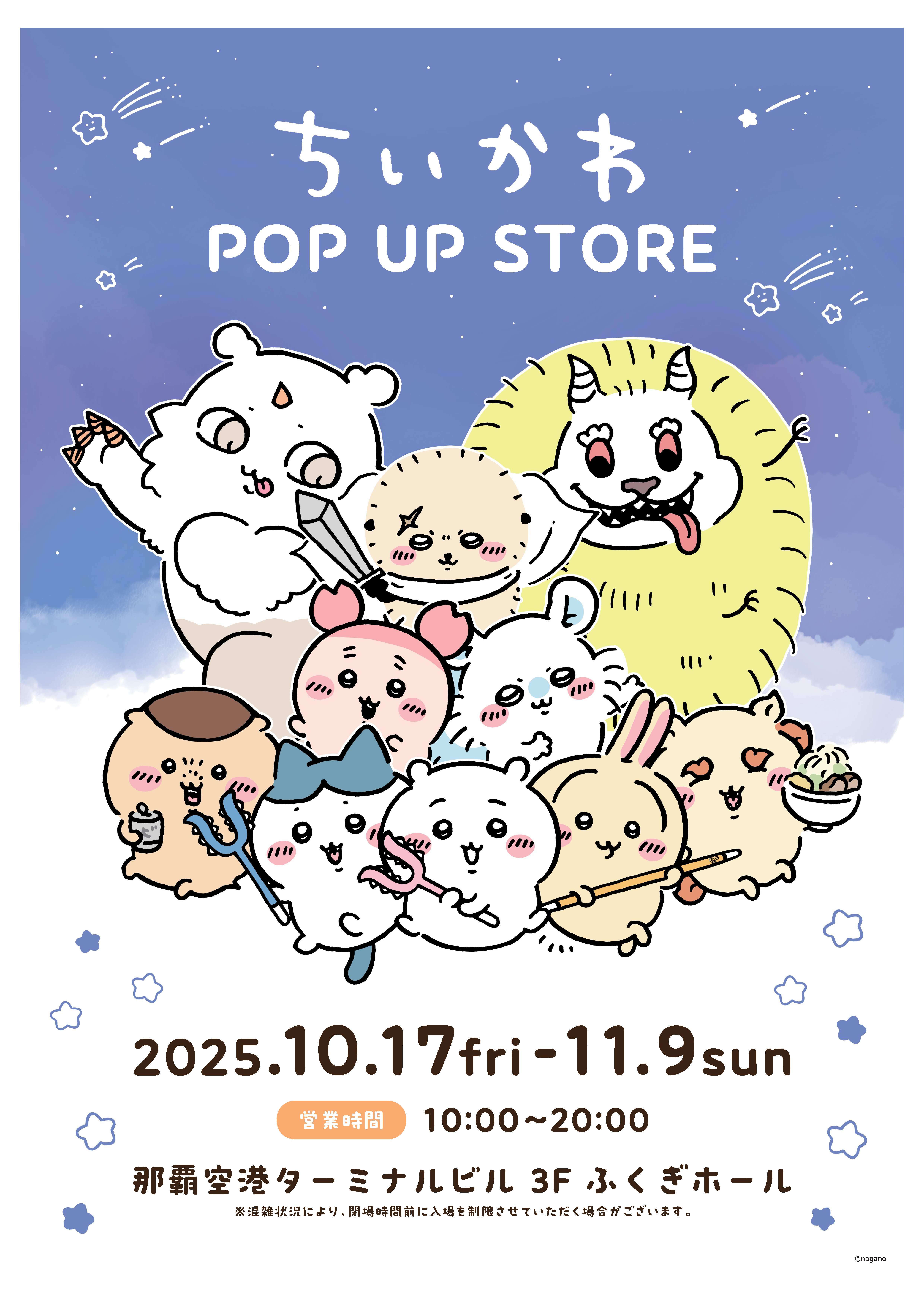 10月17日(金)~11月9日(日)、那覇空港 国際線エリア3階 ふくぎホールにて「ちいかわ POP UP STORE」が期間限定オープンいたします。