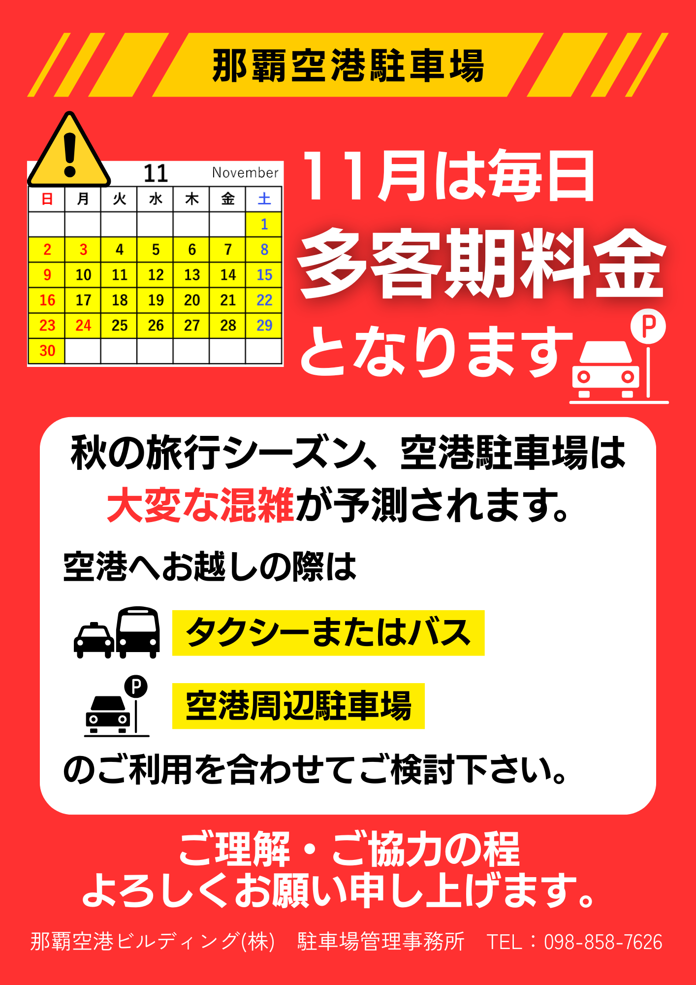 11月の1ヵ月間、那覇空港駐車場は毎日「多客期料金」の適用期間となります。