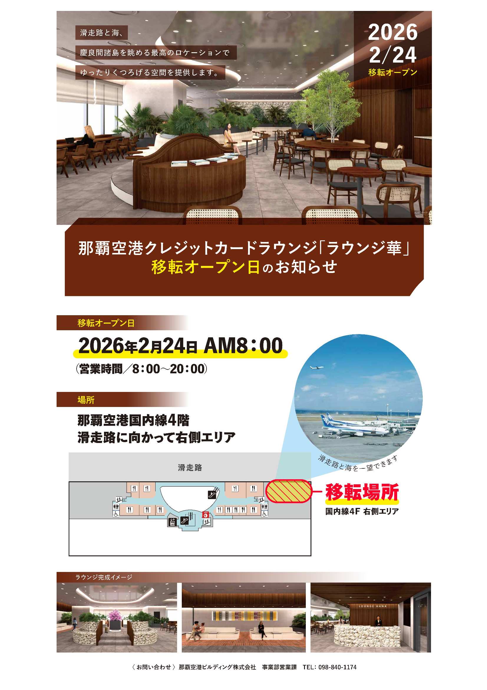 2026年2月24日、那覇空港クレジットカードラウンジ「ラウンジ華~hana~」が移転オープンいたします。