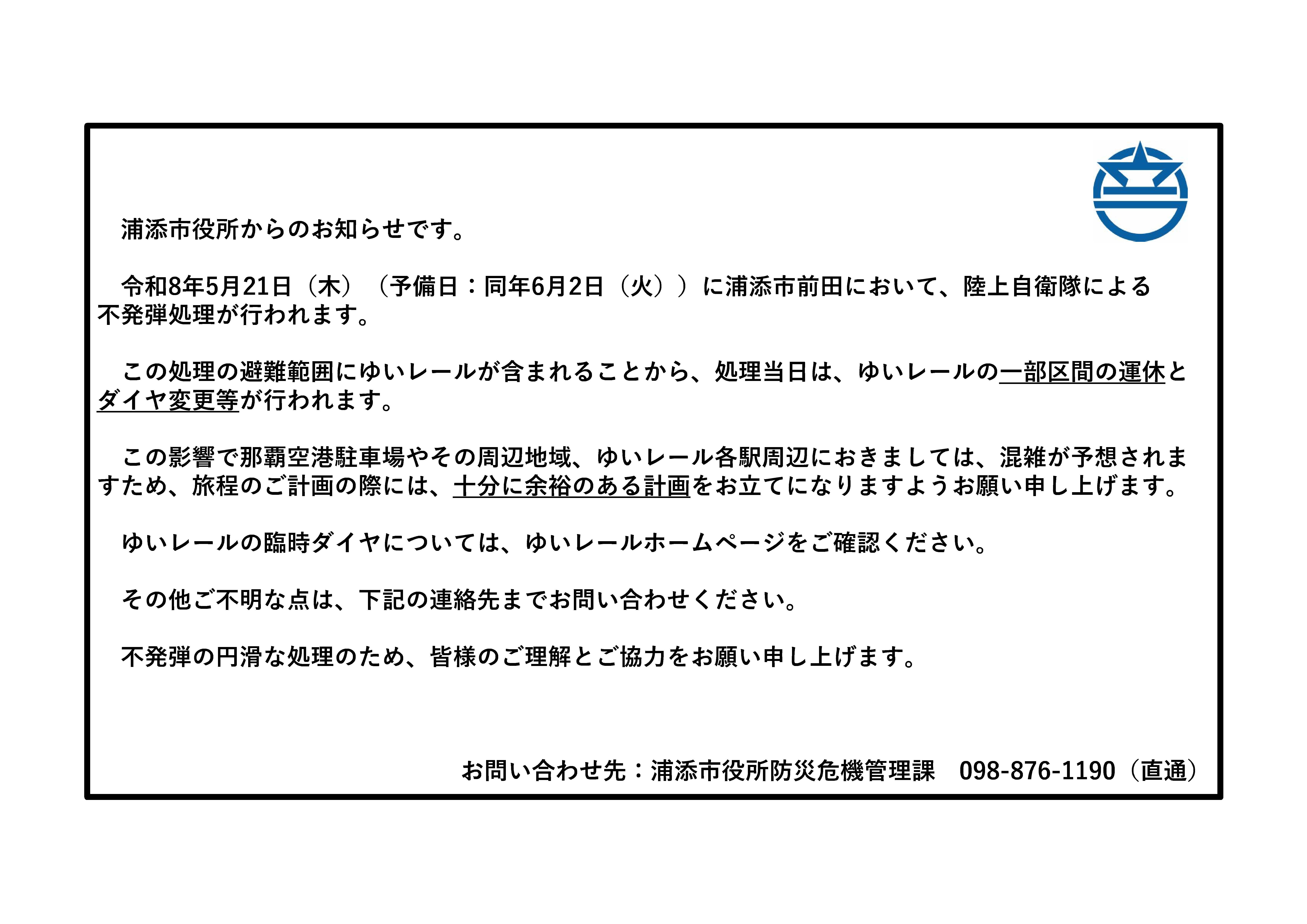【浦添市役所からのお知らせ】不発弾処理に伴うゆいレール運行変更について(那覇空港をご利用の皆さまへ)